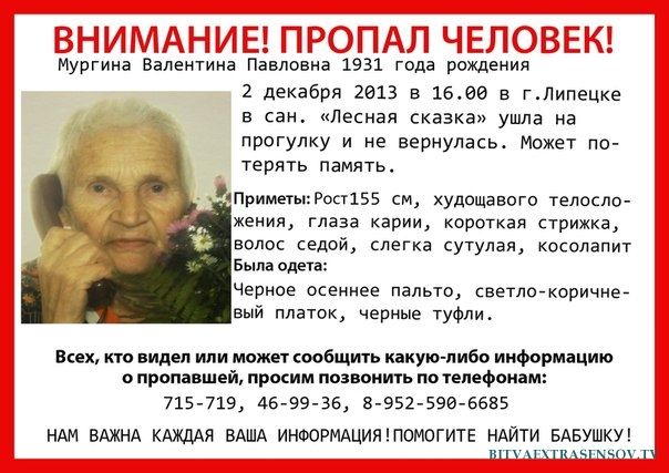 Моя родная бабушка пропала 2 декабря. Она находилась в санатории и пошла прогуляться. Кругом лес, река и очень много болотистых мест.