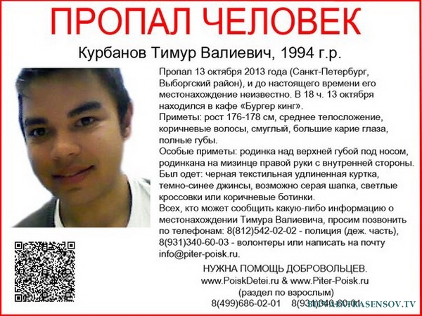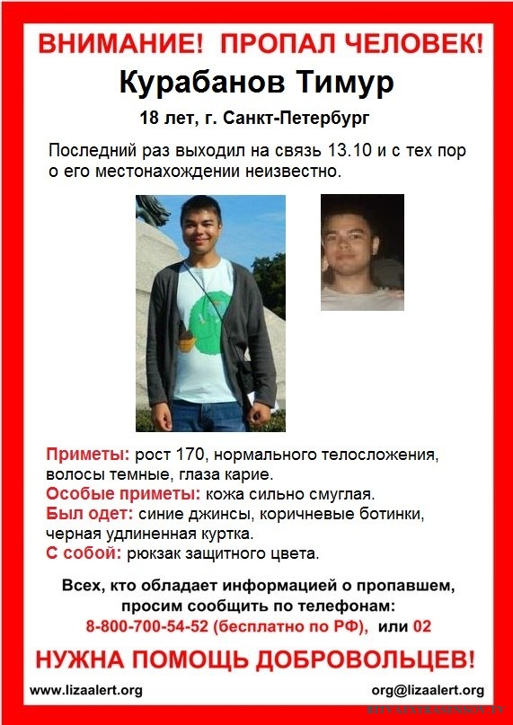 Яночка Петрова yana-kzn@mail.ru    Здравствуйте, уважаемая редакция. Смотрим все ваши выпуски и решили тоже обратится к вам, т.к. других вариантов у нас уже нет((( Помогите, нам, пожалуйста!!!! ПРОПАЛ человек, Курбанов Тимур Валиевич, 1995 года рождения. (18 лет), роддом из Ташкента, жил в Казани. Поступил учится в г. Санкт-Петербург, Ушел 13го числа из общежития по адресу Студенческая 5, последний раз выходил на связь 13.10, с тех пор о его местонахождении неизвестно. Приметы: рост 170, нормального телосложения, волосы темные, глаза карие. Особые приметы: кожа сильно смуглая. Был одет: синие джинсы, коричневые ботинки, черная удлиненная куртка. С собой: рюкзак защитного цвета. (Ходили к гадалкам, сказали что он жив, но либо без памяти, либо был избит и в тяжелом состоянии находится в «казенном» доме) Через 4 месяца нашли труп, сожженный в машине, в поселке Гатчина, г.Санкт-Петербург, точнее нашли его 14 октября, все это время он лежал и лежит до сих пор в морге в Гатчине. Следователи позвонили родителям только в конце января. Сделали тест днк, тест подтвердил что это Тимур. Родители не могут поверить что это Тимур((( Кто и за что убил и поджег мальчика, помогите нам , пожалуйста, разобраться. Телефон для связи 8919-697-88-14 (мама Тимура-Фарида); 8987-272-11-14 (Яна), yana-kzn@mail.ru.
